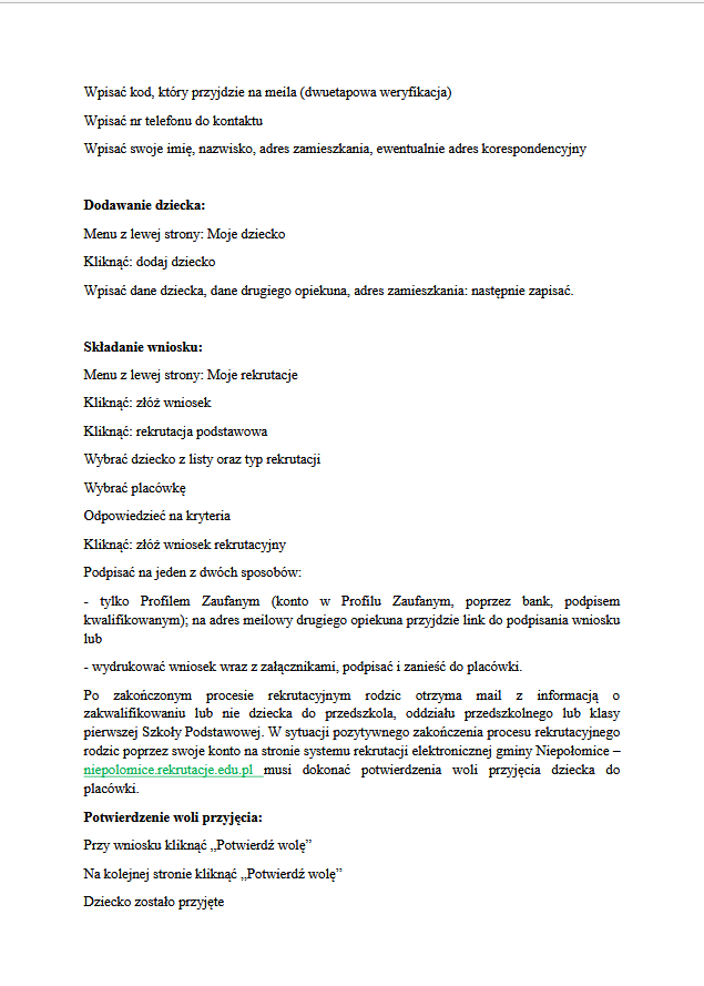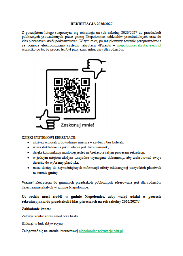 Zarządzenie Nr 13/2026 Burmistrza Miasta i Gminy Niepołomice Pobierz Załącznik nr 1 do zarządzenia 13/2026 Pobierz Załącznik nr 2 do zarządzenia 13/2026 Pobierz Zasady rekrutacji Gmina Niepołomice Pobierz Rodo w związku z rekrutacją Pobierz Szkoła Podstawowa nr 2 im. Króla Kazimierza Wielkiego w Niepołomicach32-005 Niepołomice, ul. 3 Maja 23Tel. 12 281 10 85sekretariat@sp2.eduniepolomice.pl