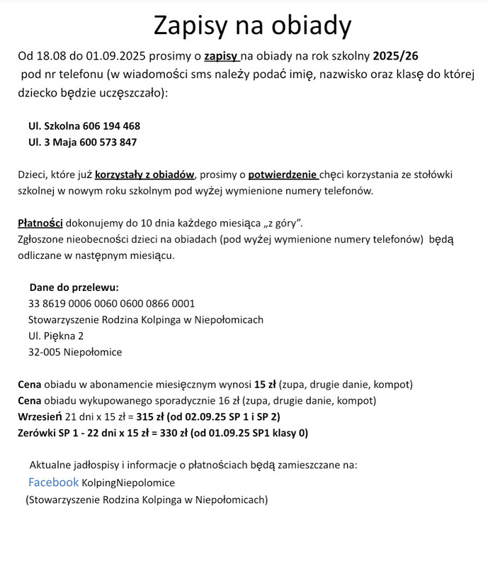 Nieobecności dzieci na obiadach prosimy zgłaszać pod wyżej wymieniony numer telefonu 600 573 847 do godz.8:30 danego dnia.